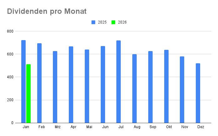 Während ich im Vorjahr noch 722,20 € an Dividenden verbuchen konnte, belaufen sich die Einnahmen für 2026 auf insgesamt 511,56 €. Das entspricht einem Rückgang von ca. 29 %.